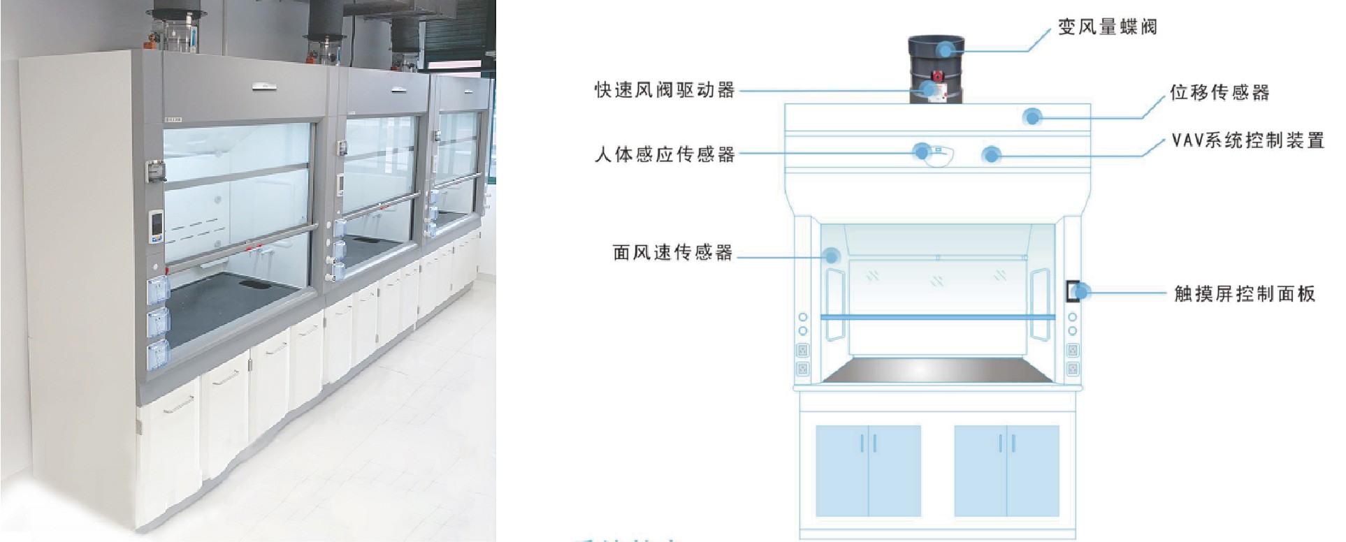 變風(fēng)量控制系統(tǒng)是現(xiàn)代實驗室建設(shè)中主要送排通風(fēng)方式,變風(fēng)量系統(tǒng)是指送風(fēng)隨著排風(fēng)而變,排風(fēng)又隨著人們的需要自動或人為設(shè)置而變,送風(fēng)與排風(fēng)形成一個動態(tài)平衡,使房間始終保持一個相對恒定的正壓或負壓。利用面風(fēng)速傳感器,通風(fēng)柜控制器檢測風(fēng)速,并利用調(diào)節(jié)閥門,來增大或減少風(fēng)速,從而控制通風(fēng)柜的面風(fēng)速維持在指定的0.3~05m/s。