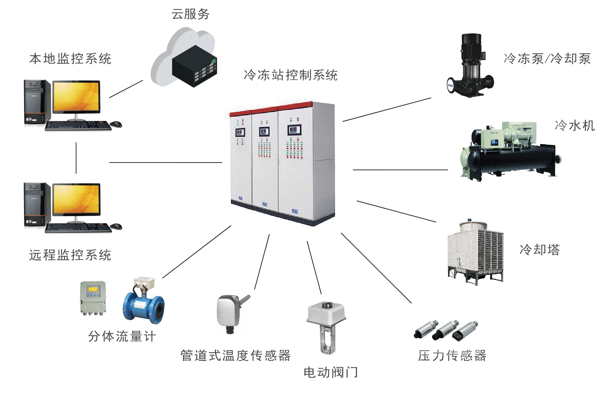 冷凍站控制系統主要應用于大型建筑空調制冷系統、工藝制冷系統、工藝冷熱交換系統等集中式冷熱源系統;可實現對冷水主機運行臺數的自動控制以及冷凍水泵、冷卻水泵、冷卻塔等設備的聯動控制和聯鎖控制,達到冷凍站無人化值守的自動化運行及高效節(jié)能運行的目標。