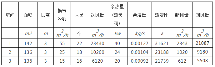 風(fēng)量負(fù)荷計(jì)算見(jiàn)下表:熱濕比的定義為空氣的焓變化和濕量變化之比 ε=Q/W Q為室內(nèi)計(jì)算的熱負(fù)荷 W為室內(nèi)計(jì)算是濕負(fù)荷