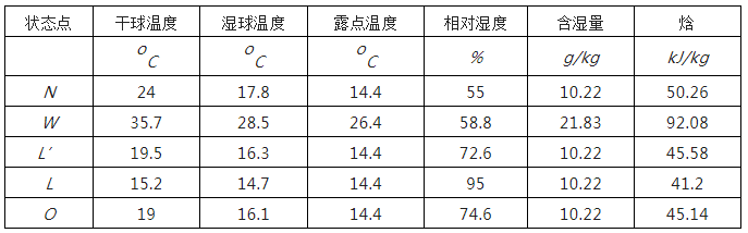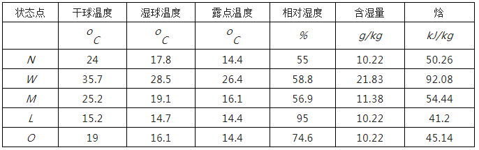 即可求出送風(fēng)狀態(tài)點(diǎn)的焓值io =45.14 kJ/kg,過(guò)io作等焓線與熱濕比線(對(duì)于高熱型電子廠房,室內(nèi)散濕量極少,主要散濕源為人體散濕,熱濕比線近似于垂直,所以對(duì)回風(fēng)的處理不能是除濕過(guò)程)的交點(diǎn)即可得送風(fēng)狀態(tài)點(diǎn)O。L點(diǎn):連接室內(nèi)點(diǎn)N與送風(fēng)狀態(tài)點(diǎn)O,并延長(zhǎng)與95%等相對(duì)濕度線相交,即得L點(diǎn)。M點(diǎn):根據(jù)新回風(fēng)混合,混合比等于新回風(fēng)之反比,即NM/MW=新風(fēng)量/回風(fēng)量,即得M點(diǎn)。各狀點(diǎn)參數(shù)見(jiàn)下表: