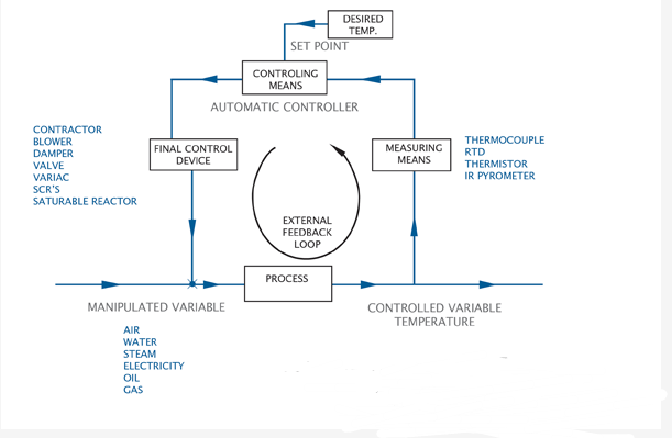 控制器將溫度信號(hào)與所需溫度(設(shè)定點(diǎn))進(jìn)行比較并啟動(dòng)最終控制裝置。最終控制裝置改變操縱變量以改變從過程中添加或吸收的熱量。溫度控制過程中的常見操作變量是空氣、水、蒸汽、電力、石油和天然氣。