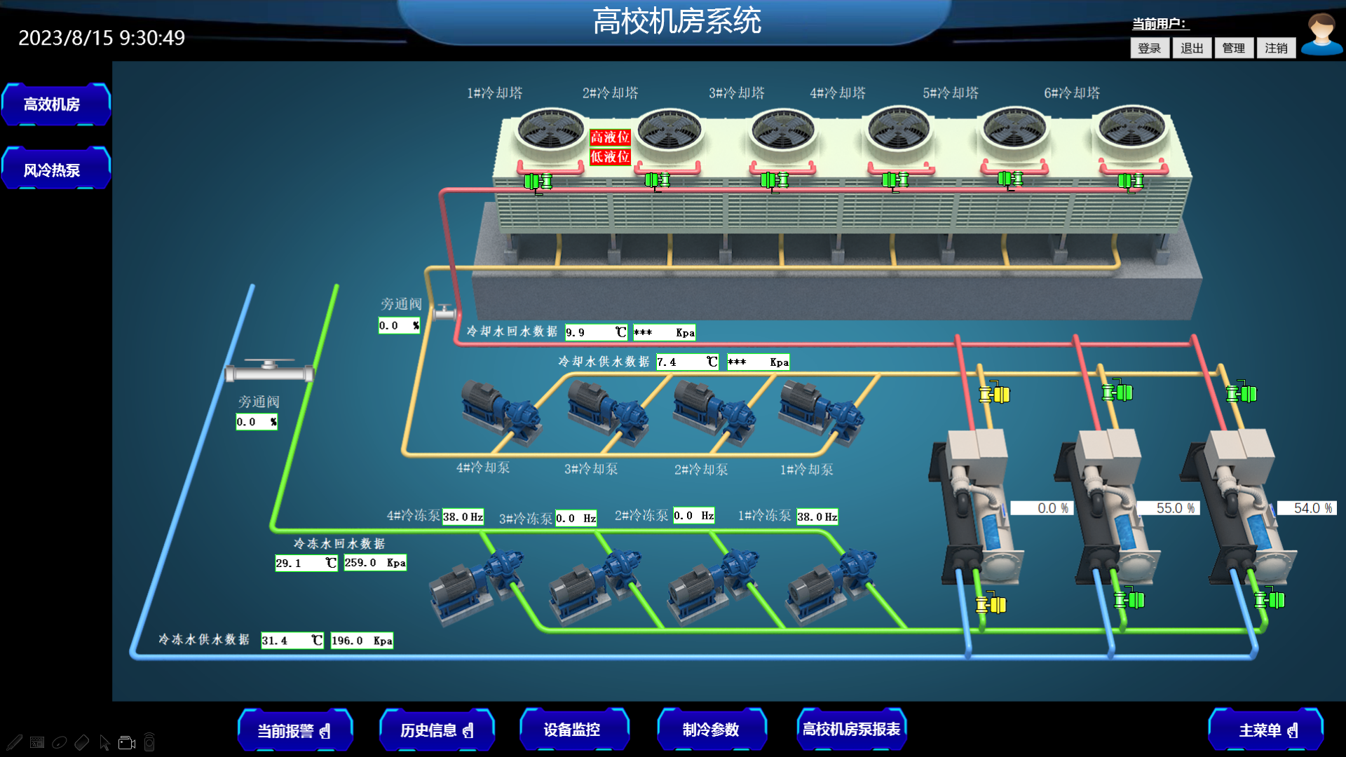 3、實(shí)現(xiàn)動(dòng)力站一鍵啟停功能:在中控室畫面上點(diǎn)擊一鍵啟停按鈕,實(shí)現(xiàn)水閥、水泵、冰機(jī)的連鎖控制,高效控制,達(dá)到節(jié)能的目標(biāo)也降低了企業(yè)管理人員數(shù)量;